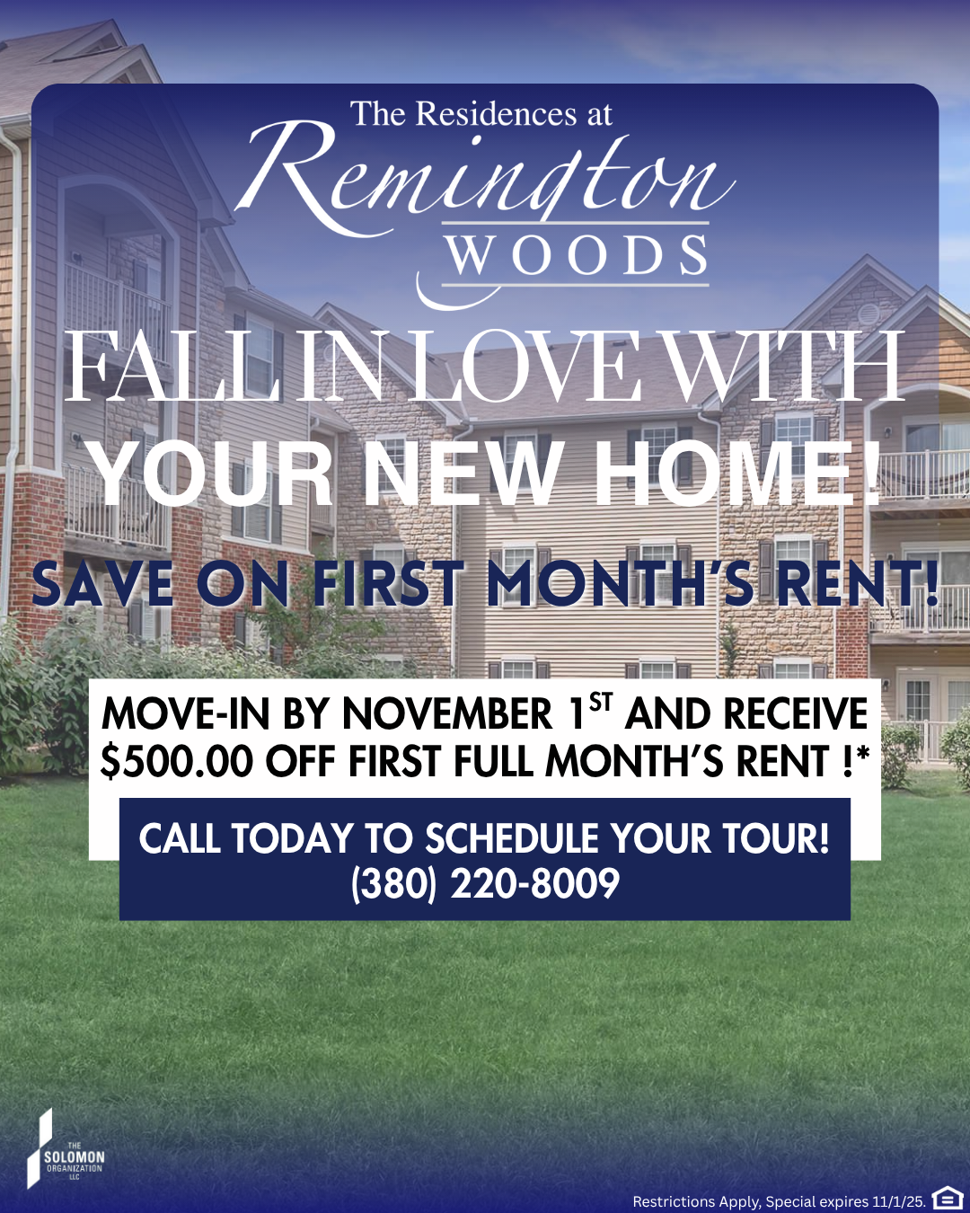 Embark on a captivating journey at Remington Woods, an enchanting apartment home community in Lewis Center, Ohio. Set against the backdrop of serene wood-lined streets, our apartments for rent seamlessly blend rural tranquility with urban accessibility. Delve into our vibrant neighborhood, where local shops, delightful dining, and abundant entertainment await your discovery. Conveniently positioned near Highway 23, a swift journey south leads to the dynamic heart of Columbus. Don't miss your chance—reach out today for comprehensive information on renting your perfect haven at Remington Woods!